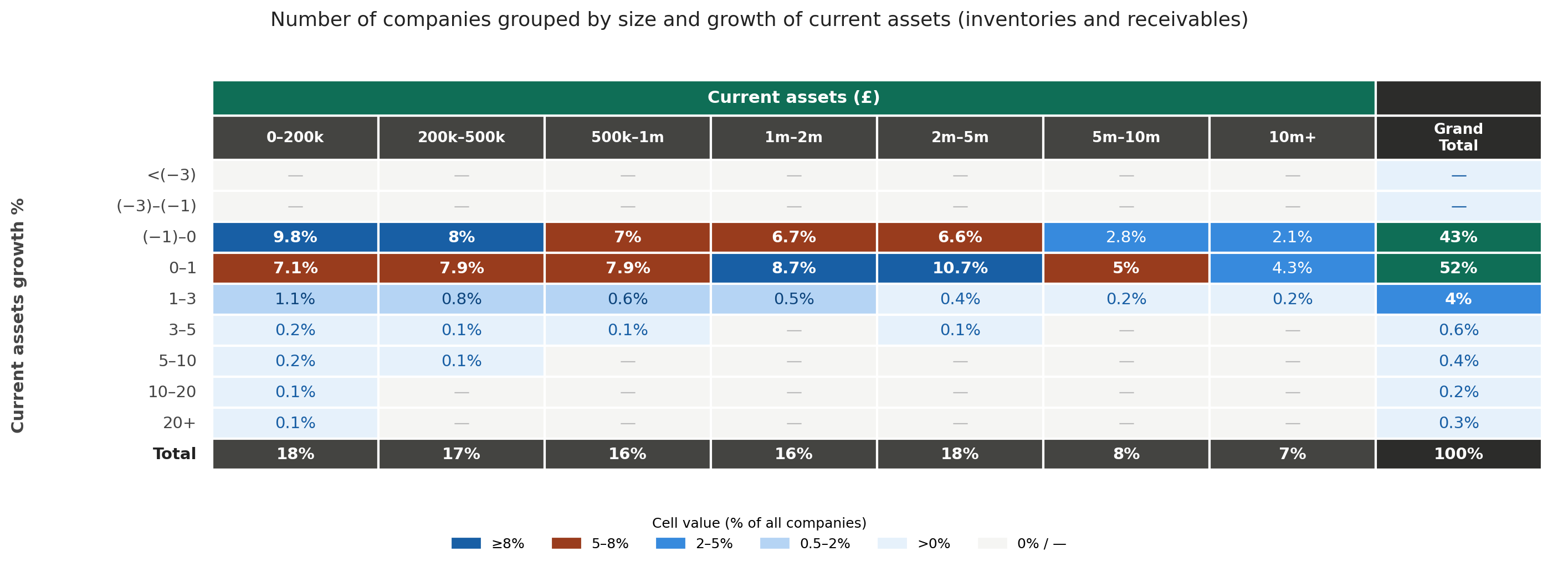 Across the market, only a very small subset – around 1% of companies (roughly 500–600 businesses) – shows any meaningful increase (>5%) in current assets such as inventories and receivables. Even these are mainly companies starting from a low base.